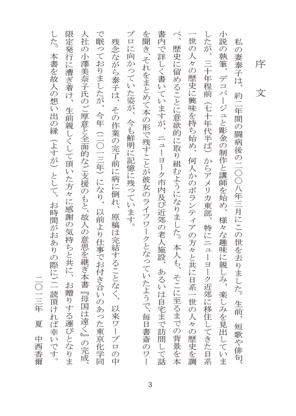 東京都出身。1969年に夫の転勤に伴い渡米(夫は、2007年度文化勲章受章者の故中西香爾コロンビア大学名誉教授)。米国移住後は、NY日本クラブにてデコパージュ及び彫金クラス講師、現地の短歌同人誌への寄稿、NY日系人会で定期的に開催される敬老会や介護施設の日系人慰問といったボランティア参加などを通し、地域日系コミュニティーとの関わりを深める。1970年代後半、偶然出会った日系一世老人の数奇な人生談に惹かれたのをきっかけに、米国東海岸日系移民の存在に興味を持ち、80年代より当時まだ健在だったNY近郊に住む日系一世のインタビューを開始。以後10数年間に渡り、多くの貴重な生の声を精力的に収集、米国東海岸日系移民史の発掘と一般に於ける認知をライフワークとするようになる。本書に納められたインタビューは、これまで滅多に語られることのなかった日系一世の日常生活、歩んできた軌跡を、彼ら自身の目線から記録した資料としての価値も高い。1994年、短歌集『故国ありぬ』(ながらみ書房)を発行。2008年没。